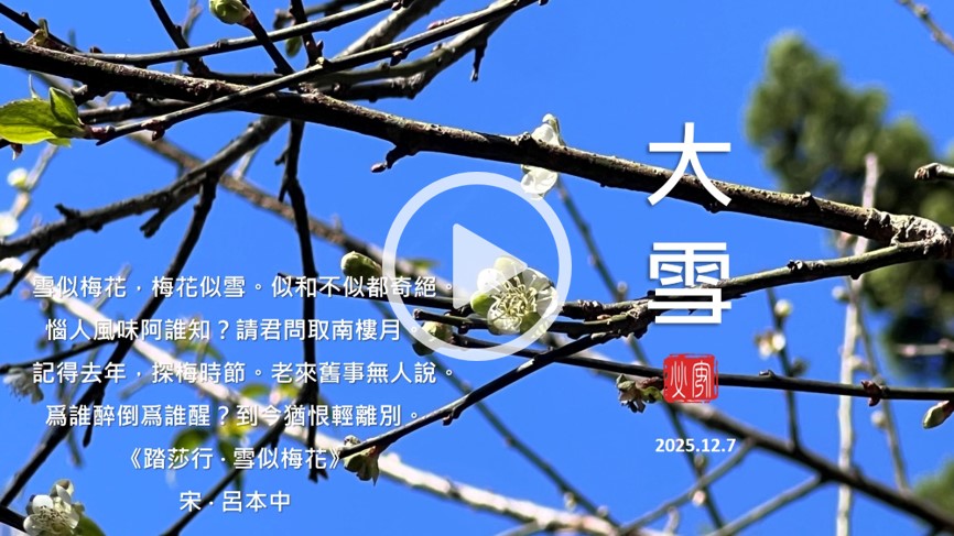 午後的藥草園,冬陽溫煦高照,天空飄著幾許淡雲。在湛藍的背景映襯下,園中植物顯得格外蓬勃有朝氣。白梅、桃花、碧桃花已迫不及待地競相綻放枝頭,微風送來馥郁花香,令人錯覺春天已然降臨。特別引人注目的是,多年未見的貓鬚草,正靜靜地在階梯旁展現其雅緻芳姿,若非細心觀察一草一木,這份驚喜便容易錯過。後山的金桔樹上掛滿了黃澄澄的果實,一片金黃,象徵著來年的金玉滿堂與豐盛吉祥。而聖誕樹和楓樹已漸次染上秋末冬初的豔麗色彩,默默預告著隆冬將至。