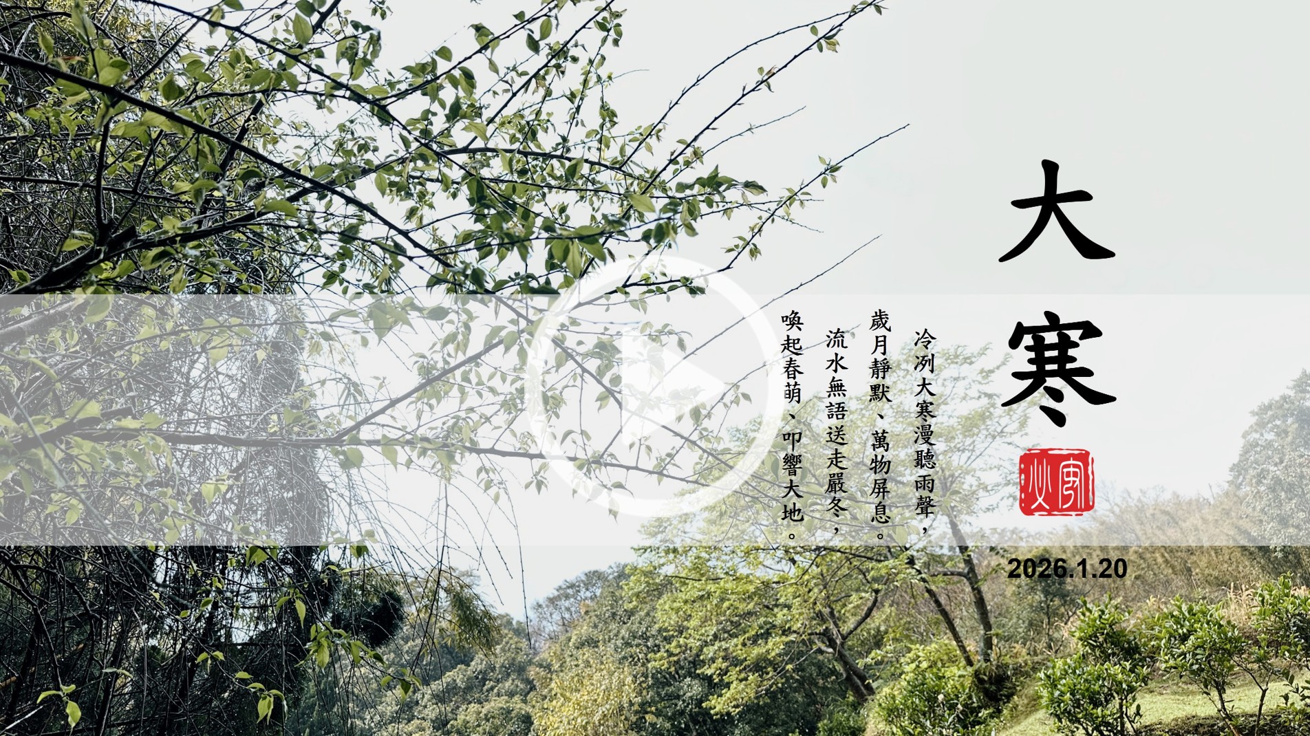 時序更迭,歲末來到「大寒」,意味一年裡天氣最寒冷的時節。俗諺云:「大寒天若雨,正二三月雨水多。」昨日北台灣已降下降綿細雨,對應俗諺,諭示來春萬物將得豐沛雨水的滋養。作為二十四節氣的終章,大寒不僅是隆冬的頂峰,更是嚴冬將盡、春風將起的轉折點,在蕭瑟的冬景中蘊藏著生命循環的嶄新契機。