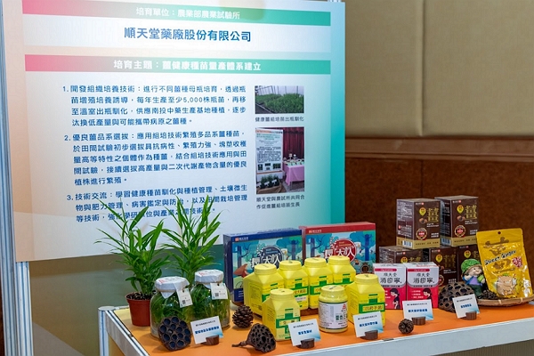 在本屆畢業成果中,涵蓋流程優化、技術加值與產品開發等多元面向。其中,順天堂藥廠股份有限公司的在地種植成果廣受矚目。順天堂多年來積極投入中藥材本土化栽培,從2013年起率先在台灣建立石斛示範基地,憑藉創新技術與反覆試驗,成功育成適合本地環境的優質石斛,並進一步開發凍飲、茶包等創新產品,展現藥材從田間到商品的完整鏈結。此次在農業試驗所的輔導下,順天堂亦選育出具抗病性與繁殖力強的優良種薑,建立健康種苗量產體系,不僅解決田間量產及病害問題,更為薑的永續種植奠定基礎。該成果對於提升台灣中藥材自給率、減少進口依賴具有重大意義。。