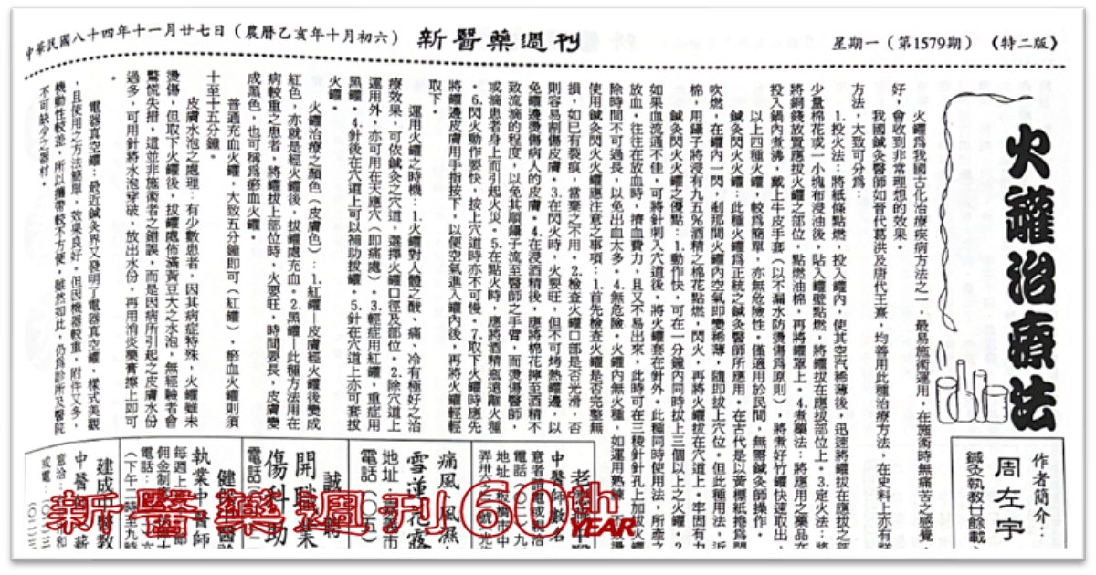 火罐為我國古代治療疾病方法之一,最易施術運用,在施術時無痛苦之感覺,如運用技術及處方良好,會收到非常理想的效果。